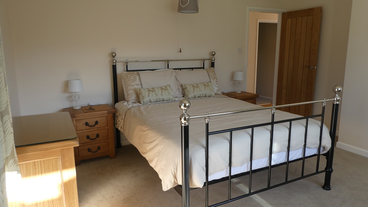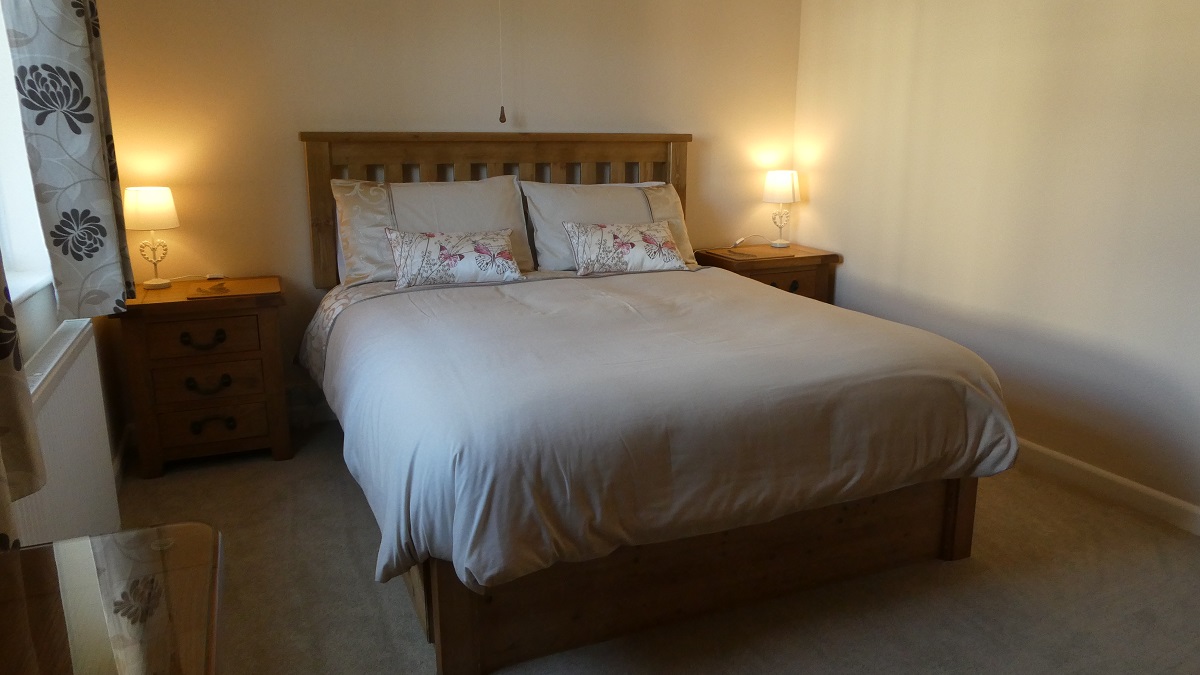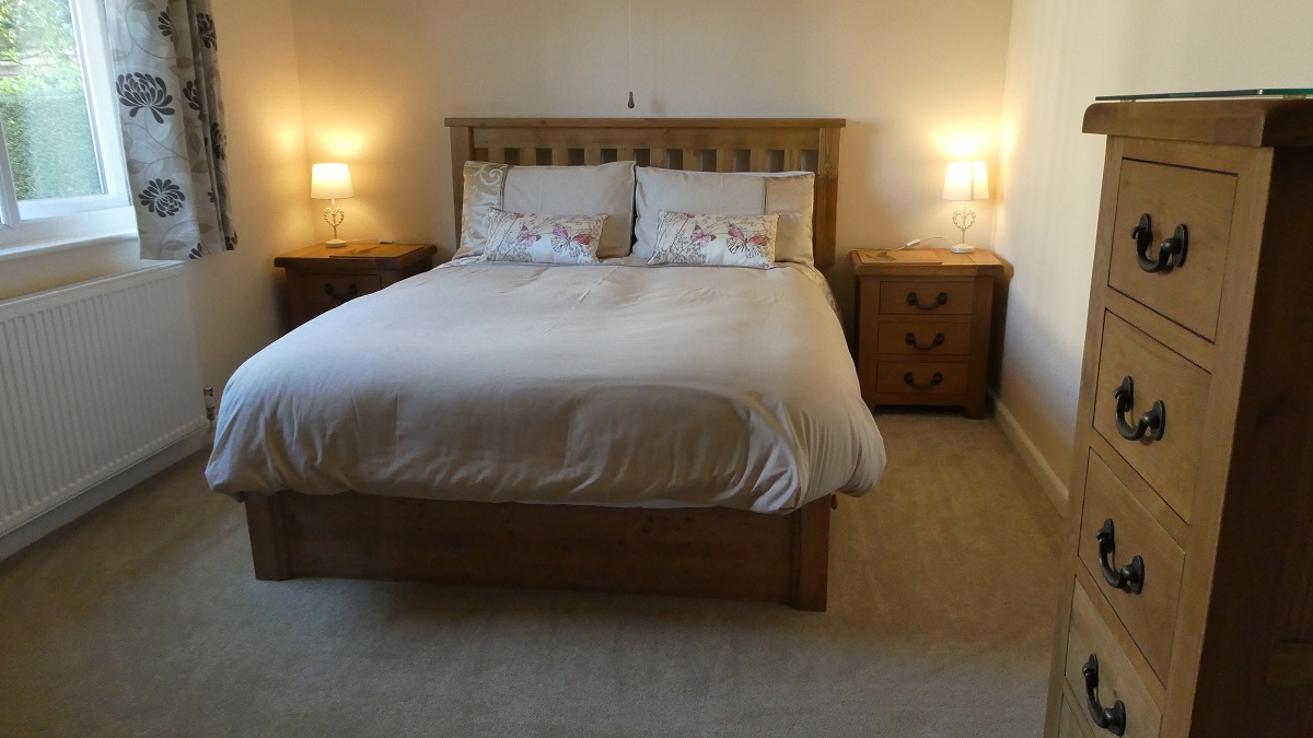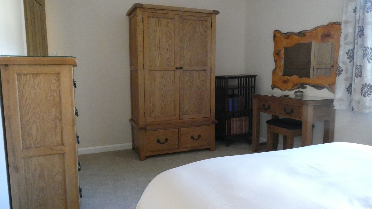 The second bedroom: At the rear of the bungalow there is another king size room again with a pocket sprung mattress with memory foam topper set on a solid pine king size base. The room is beautifully furnished with a large solid oak wardrobe with drawers, a chest of drawers, dressing table and bedside cabinets.
