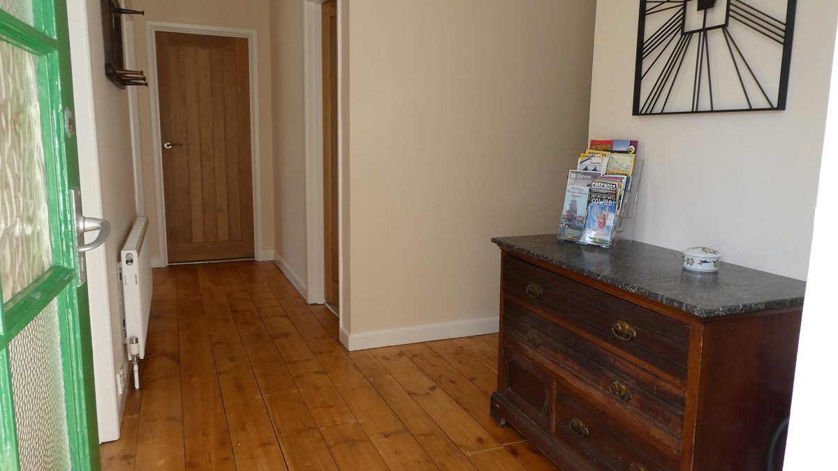 Entrance Hall: Entry to the bungalow is up two small risers with grab rails into the entrance hall with polished pine floorboards and a marble topped sideboard and coat rack. All rooms lead off the hallway as follows: