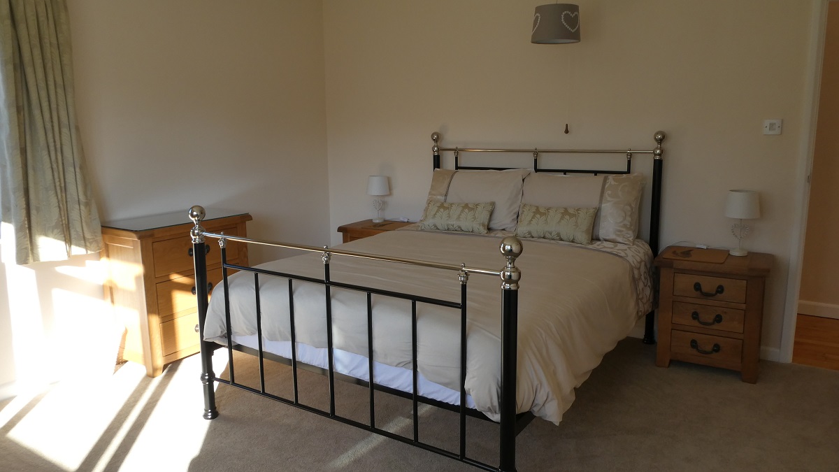 The master bedroom: A spacious bedroom with ample storage in a large double, built in wardrobe, solid oak chest of drawers, dressing table and bedside cabinets. Sink into our pocket sprung mattress with memory foam topper on the Victorian style wrought iron king size bed or relax in a lovely bedroom chair overlooking the garden.