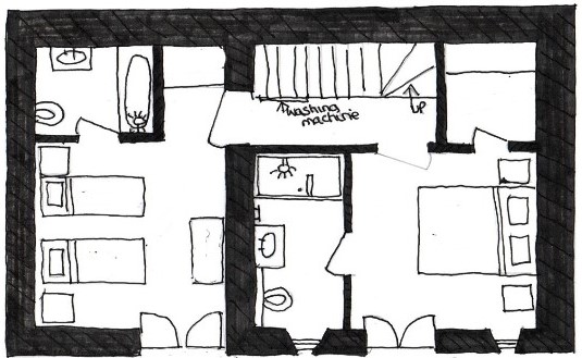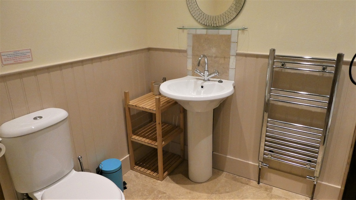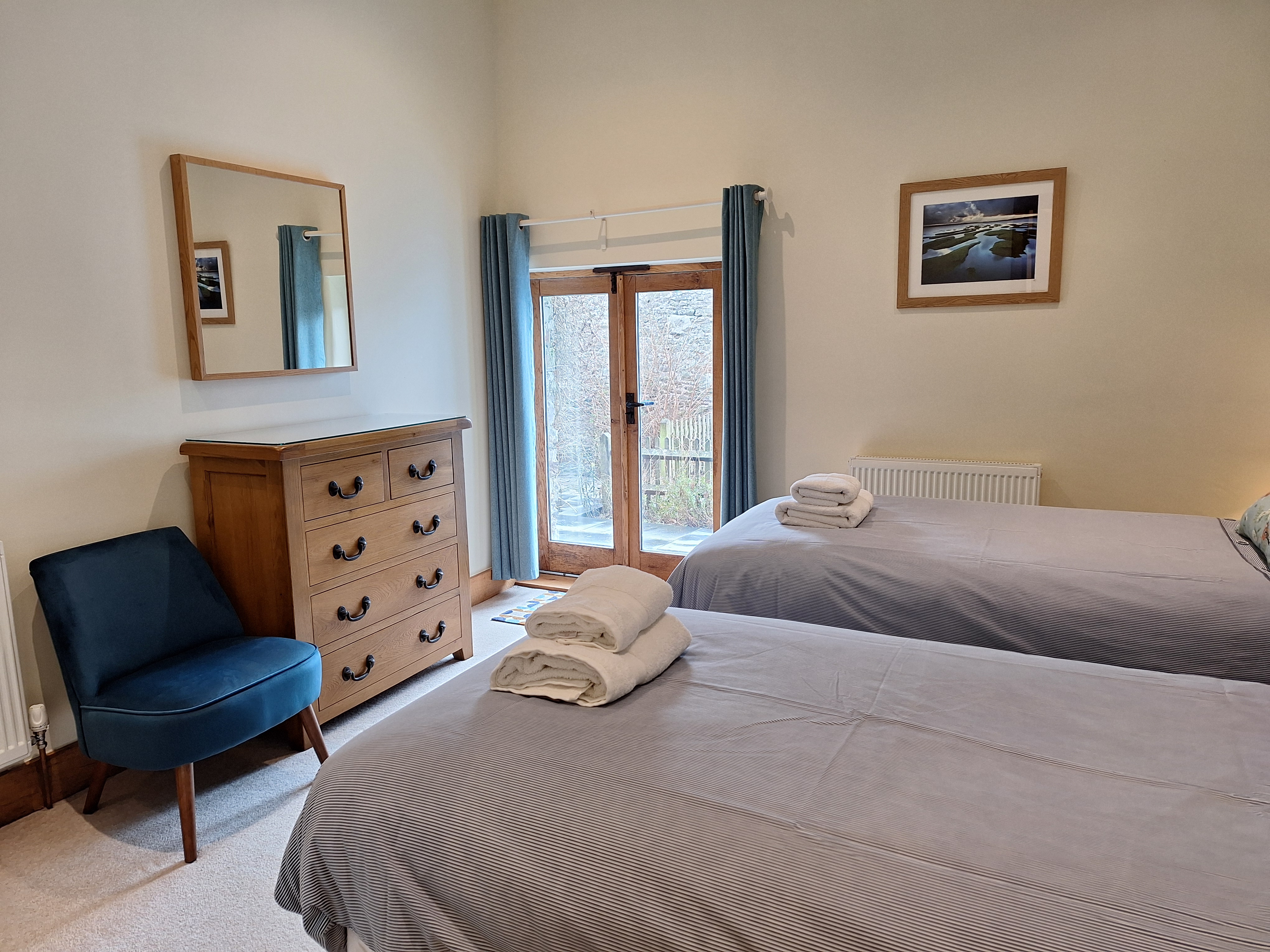 The two further en-suite bedrooms are located on the lower floor where you will also find a washer/dryer and under stairs cupboard with ironing board, clothes airer, hoover and table extensions. There are French doors from both the downstairs bedrooms onto the terrace at the rear of the cottage (see outdoor space)