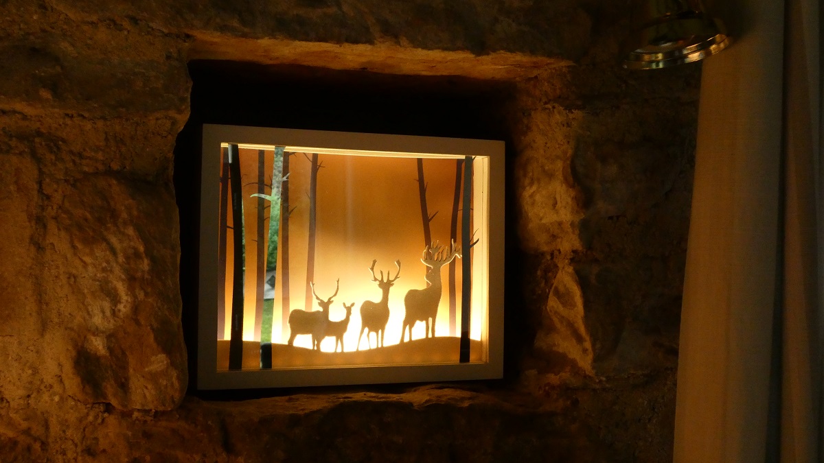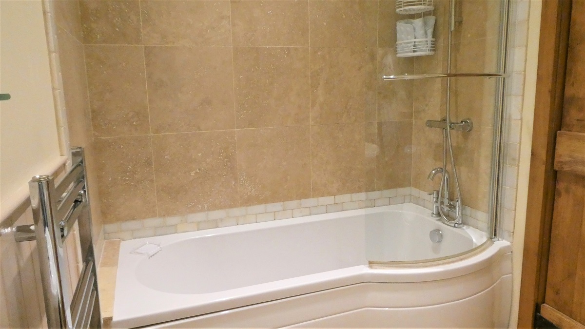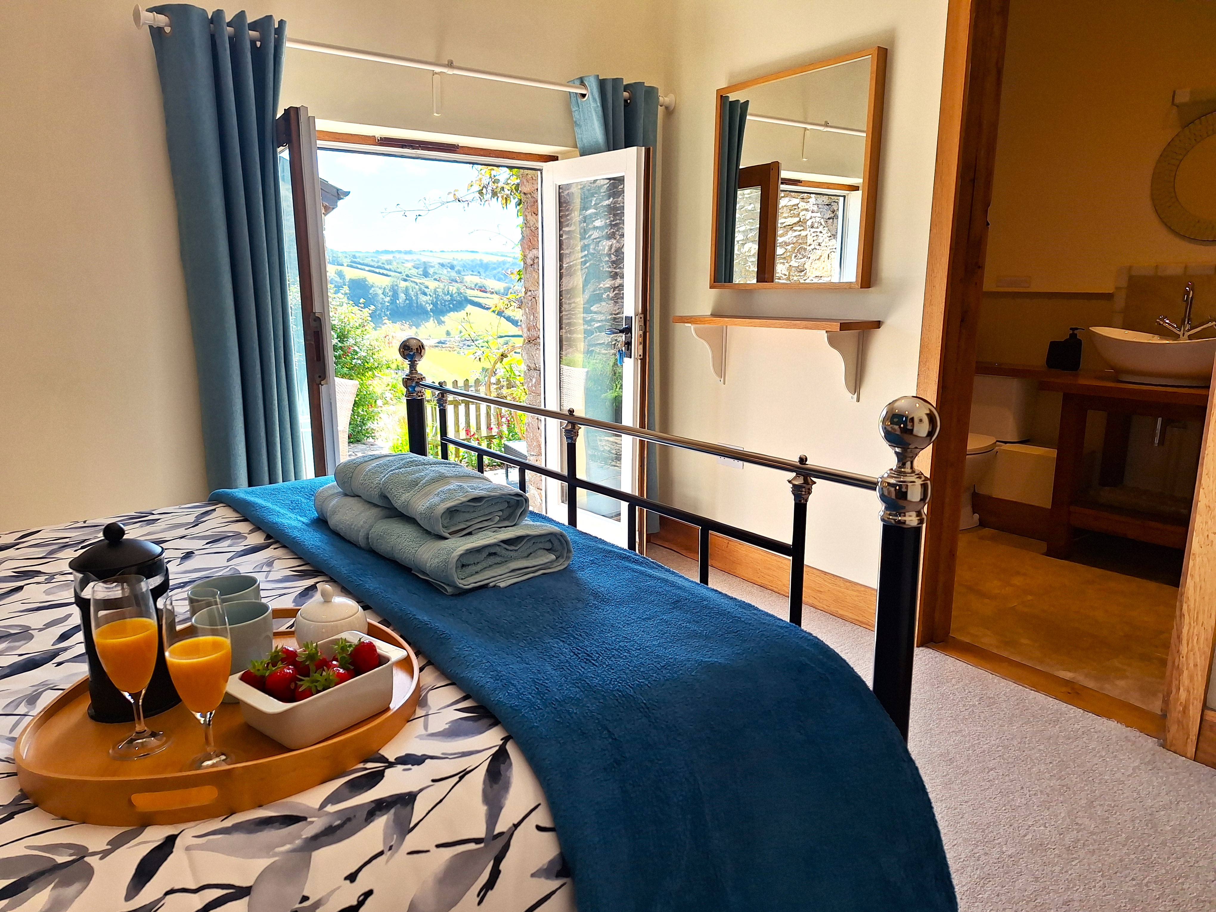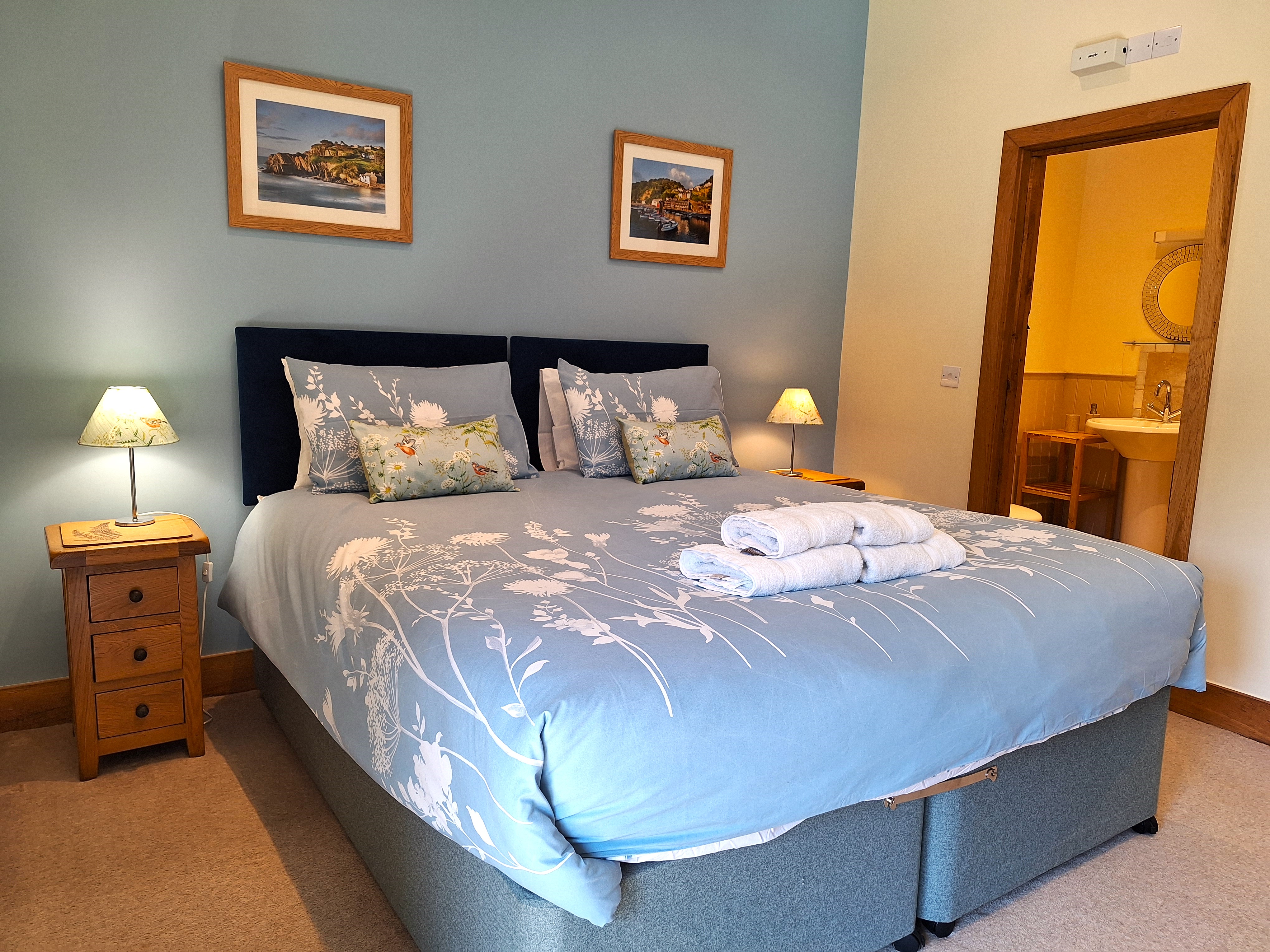 Upstairs bedroom: The first of our three en-suite bedrooms is a King size just off the lounge area. Here you will find a beautiful wrought iron king size bed with pocket sprung mattress with a memory foam topper, oak bedside cabinets and wardrobe with views out over the dog garden to the countryside beyond. The limestone, luxury en-suite shower room has a large walk in shower with rainfall shower head and massage jet system for the ultimate in luxury showering as well as a loo and washbasin. This room is perfect for extended family holidays.