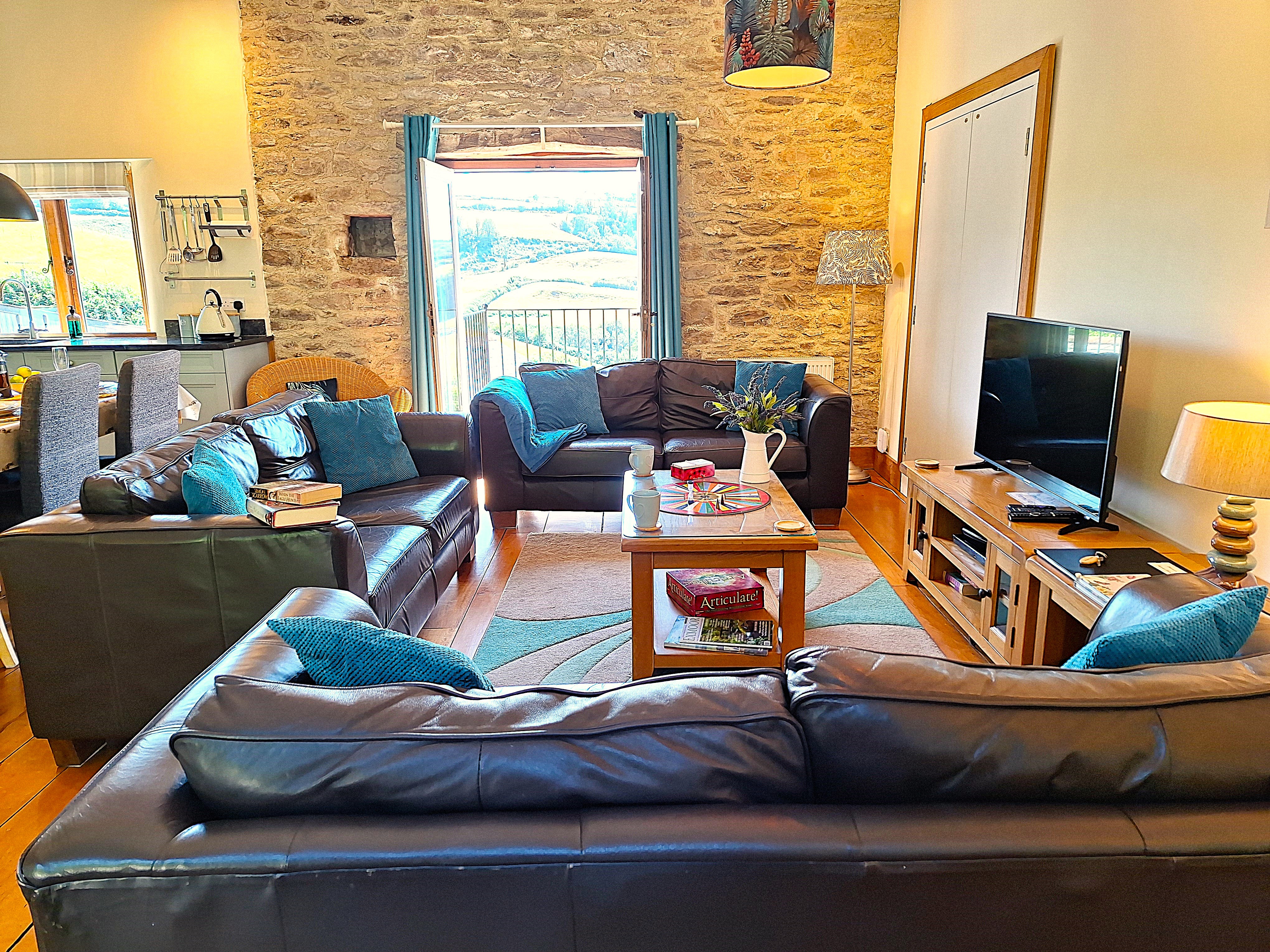 Nutcombe Barn, our largest cottage is a semi-detached Grade II listed barn conversion, next door to Cider house (to the right of the main picture). The perfect cottage for larger families, sleeping up to six in three en-suite rooms, two Kings size rooms, one of which is at ground level so perfect for Grandparents, and a Twin/Super-King. Stunning views across the valley from all rooms, large open plan living area with two outside seating areas. Adjacent to our dog garden so again perfect for those with dogs. Can be booked with Cider House to create one larger property sleeping up to 10 in 5 en-suite rooms. Couples discount of 10% if only using one bedroom.