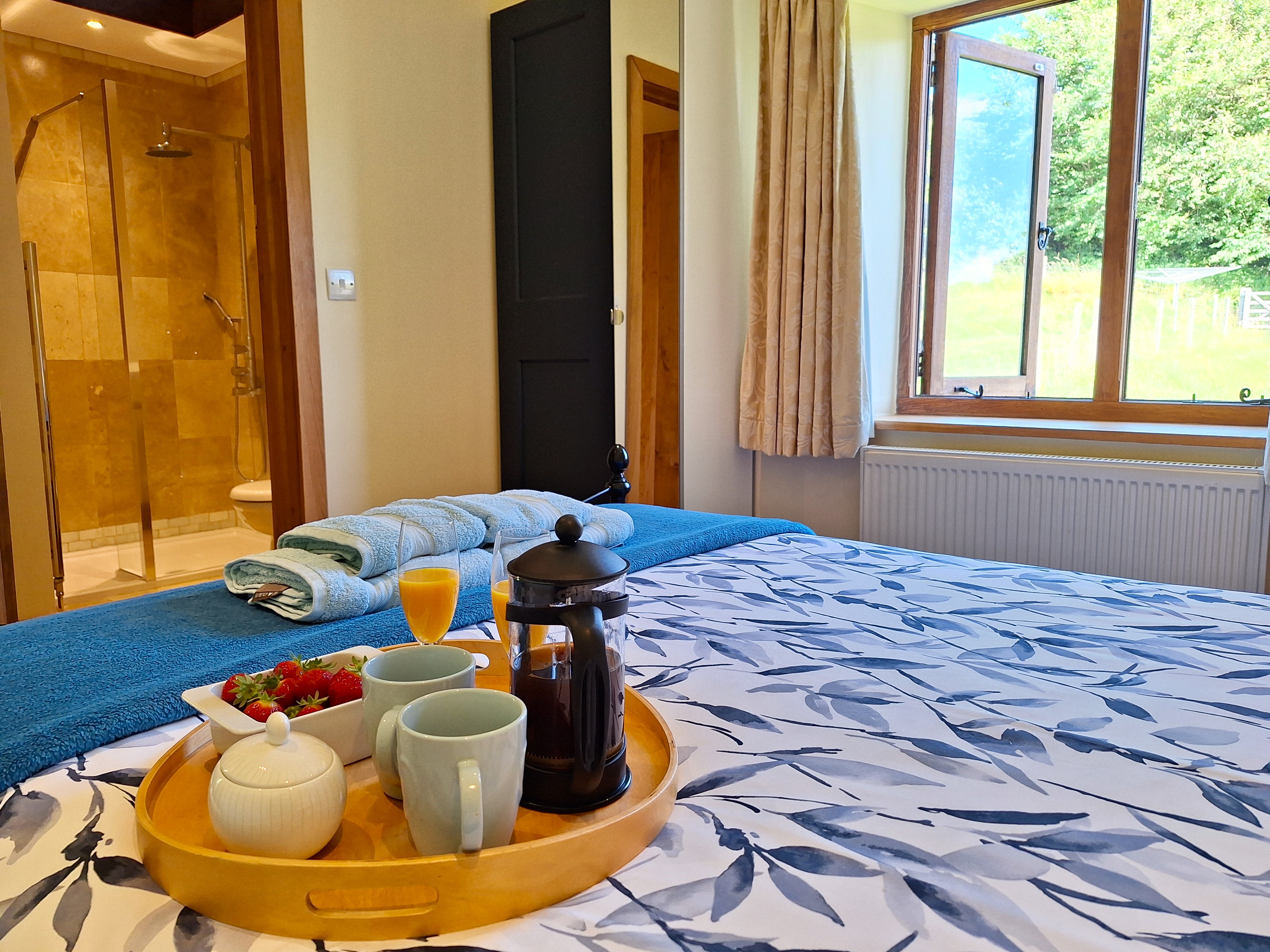 The master bedroom: Sleep like a king with cotton linen in our beautiful Victorian style bed with a pocket sprung mattress with memory foam topper and wake to great views over the garden to the fields beyond. A spacious room with solid oak bedside cabinets with the added luxury of a large walk in wardrobe so plenty of space to store all your essentials. There is also a beautiful limestone en-suite shower room with extra-large walk-in shower with rainfall shower head and massage jet system for the ultimate in luxury bathing.