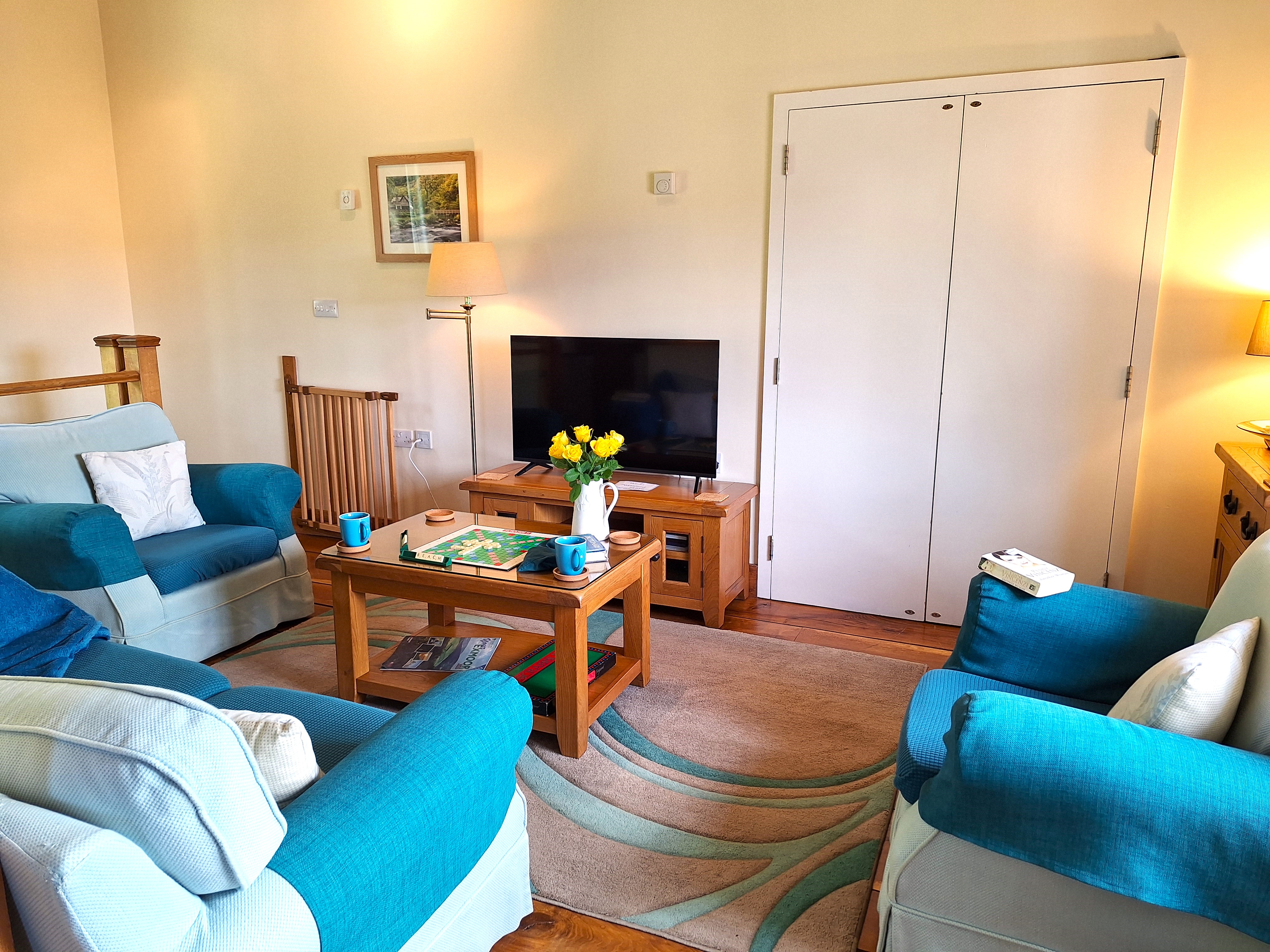 The open plan lounge area: Enjoy the comforts of home on our Next two-seater sofa or one of two armchairs, perfectly positioned to enjoy the views from the lounge window or watch the 48" Smart TV with Freesat offering over 200 channels. There is also a DVD player and a small selection of books. The furniture is solid oak to match the flooring.