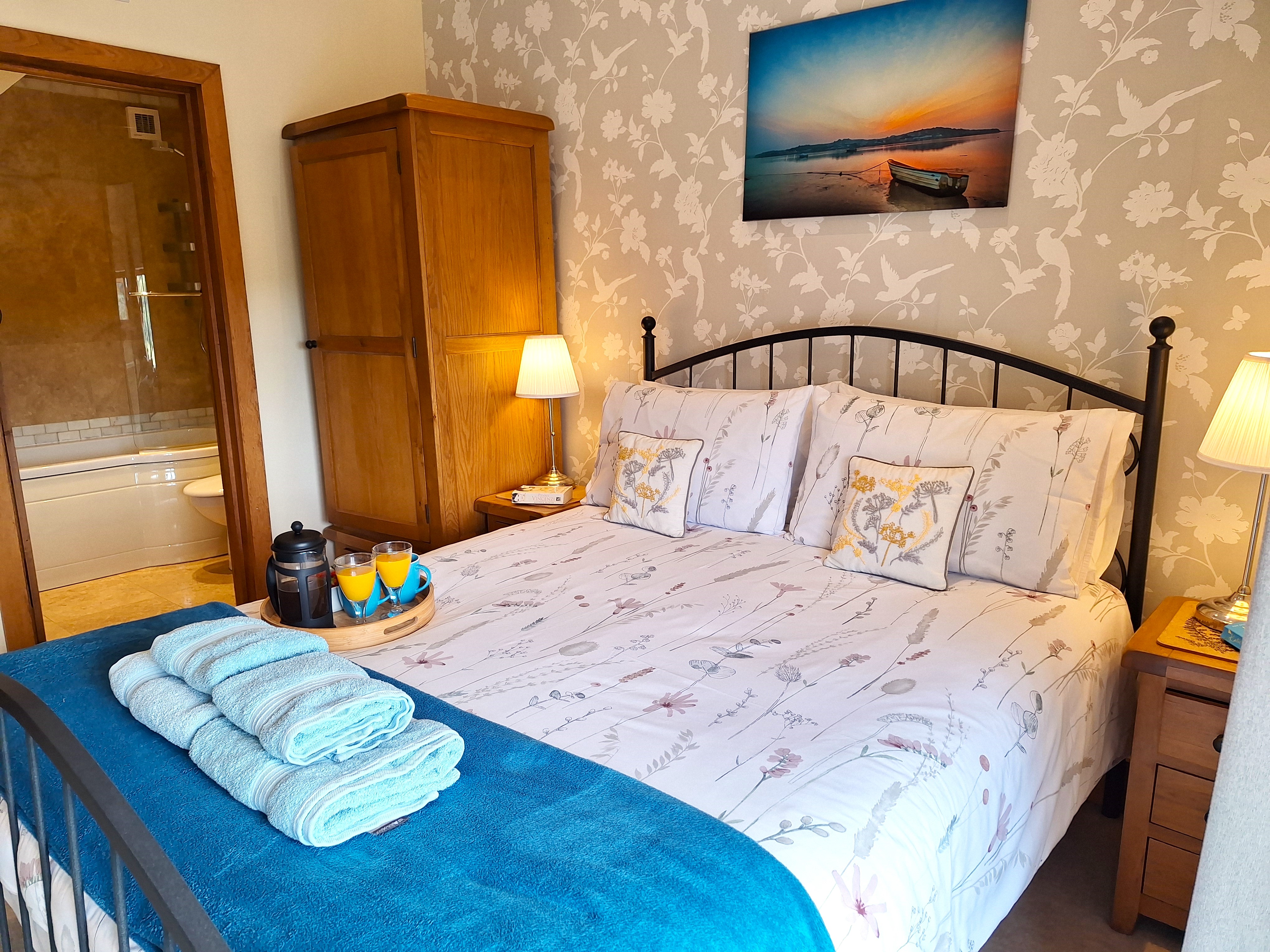 The king size bedroom: Enjoy the perfect nights sleep in our wrought iron king size bed with a pocket sprung mattress with memory foam topper or just lie and look out of the window at the countryside views. Furnished with a large oak wardrobe with lower drawer and oak bedside cabinets. You can also enjoy long lazy soaks in the full size bath with an overhead shower in the limestone en-suite bathroom. We also supply a hairdryer, iron and ironing board.