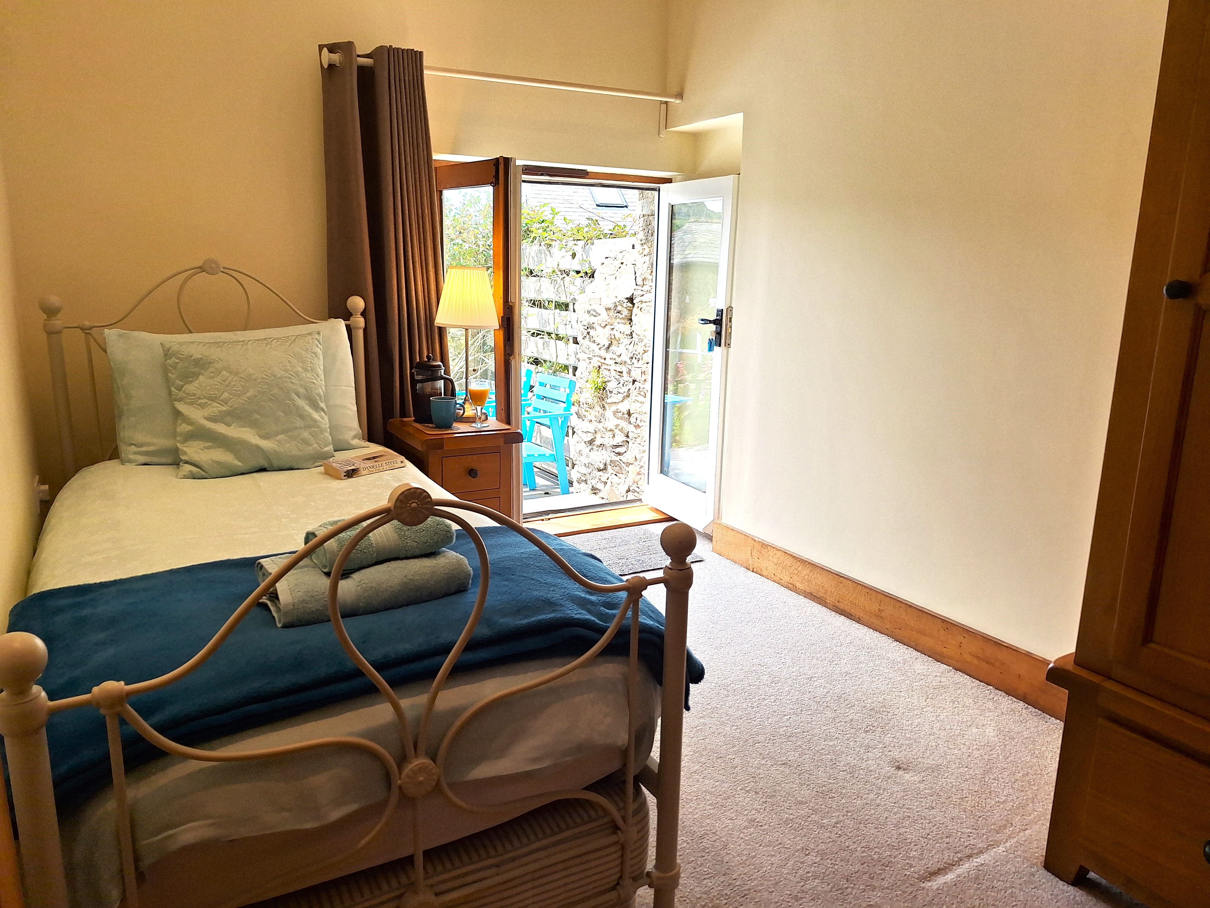 The single/small twin bedroom: The smaller bedroom also has the luxury of a pretty wrought iron single bed with a pocket sprung mattress with a memory foam topper with a full-size trundle bed beneath so that the room can be set up as a small twin, making it perfect for two children. There is a large wardrobe with lower drawer and an oak bedside cabinet. You will also find yet another en-suite shower room with large walk in shower with rainfall shower head and massage jet system for the ultimate in luxury showering making Cider House perfect for families of three or four. There is access to the terrace from this room through French doors.