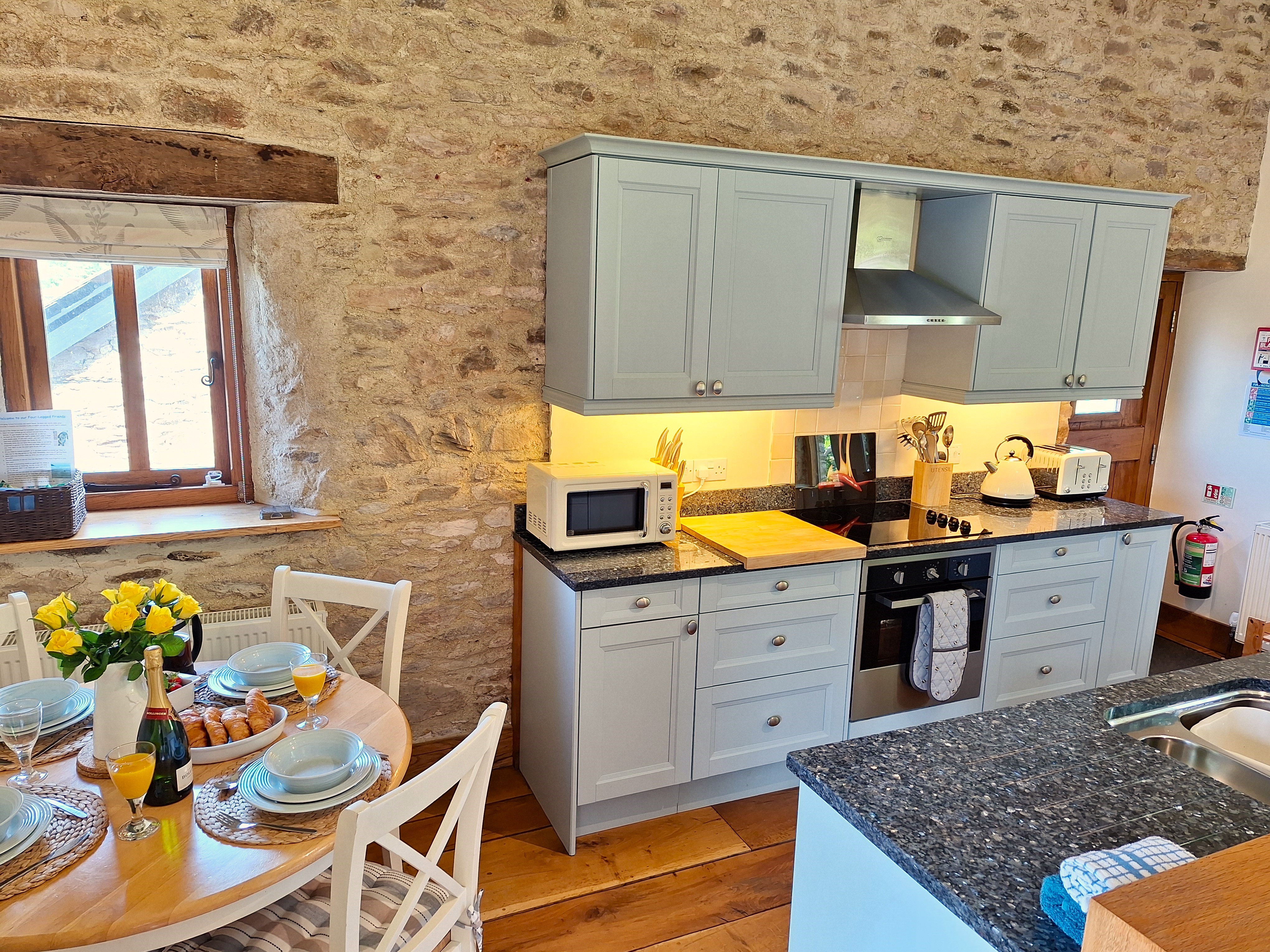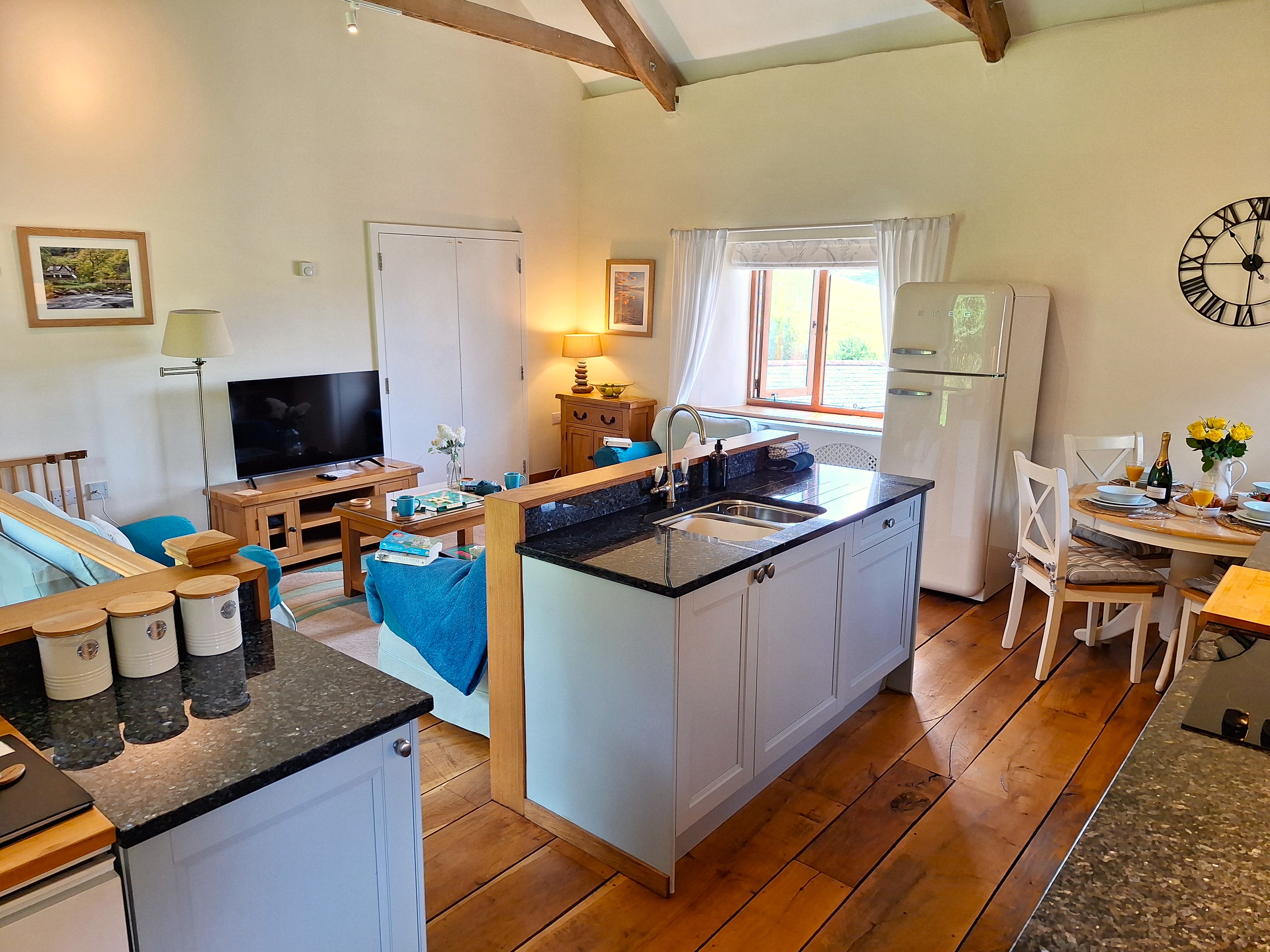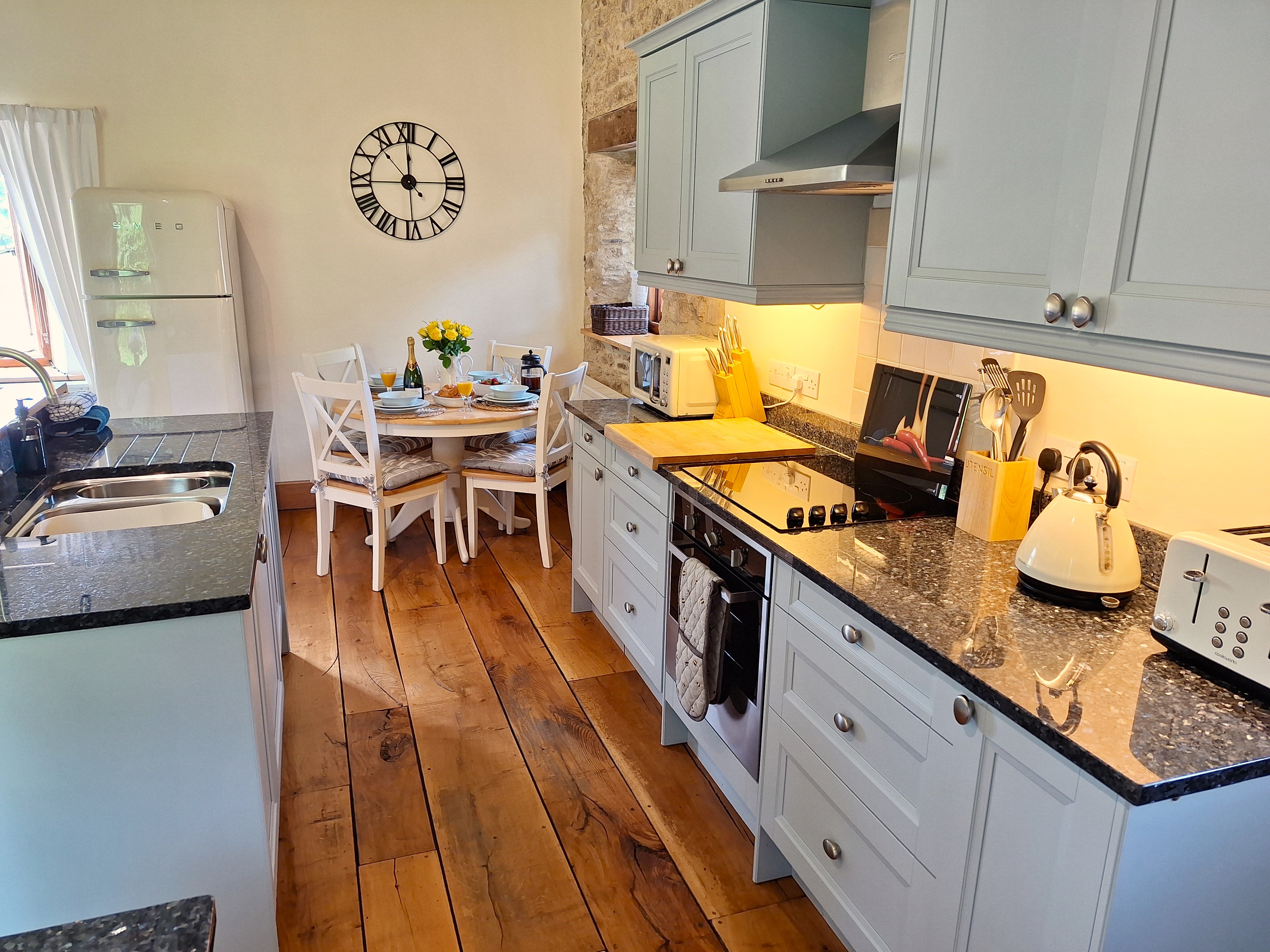 The kitchen/dining area: A shaker style kitchen fitted with black granite work surfaces fully equipped with everything you need for a self catering holiday with a Smeg fridge/freezer, ceramic hob and electric oven, dishwasher, microwave, toaster and kettle and plenty of crockery. There is a sociable round dining table with four chairs for cosy dinners in.