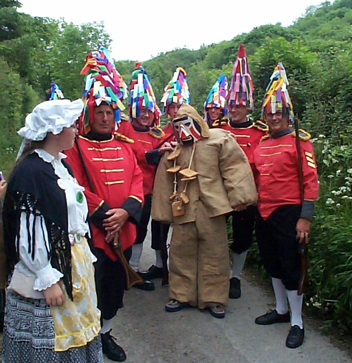 An undeniably unique event in the Combe Martin Calendar. Banned in 1837 for licentiousness and drunken behaviour, the Hunting of the Earl of Rone was revived in 1974. Nobody knows how old this custom is, but the exploits of the central character, from which the custom takes its name, can be traced back to 1607. The custom may be considerably older, even predating Celtic and Christian influences. Over the four days, the Grenadiers, Hobby Horse, Fool and villagers hunt through the village for the Earl of Rone, finally finding him on the Monday night. The hunt starts on Friday evening around the village, Saturday is the juniors day, led by children from Combe Martin School. the hunting continues on Sunday afternoon with the addition of a band. Monday evening sees the last hunting when the Earl of Rone is finally captured. He is mounted back to front on a donkey and paraded through the village accompanied by hundreds of villagers, reaching the beach at sunset. He is frequently shot by the grenadiers and falls from the donkey, only to be revived by the hobby horse and Fool, re-mounted on the donkey and carried onwards to his fate. At the final shooting on the beach, he is not revived but thrown into the sea.